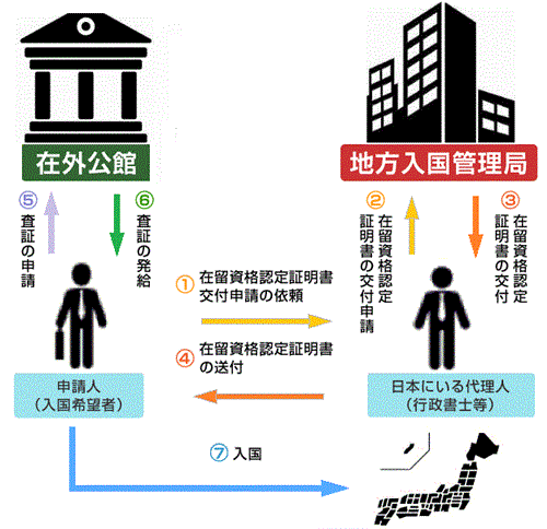 この方法は、行政書士などが日本国内で「在留資格認定証明書」の申請をし、交付を受けて同証明書を添えて(ビザ)査証を申請するものです。短期間で比較的スムーズに発給されます。これは、上述の国を超えての複数の行政機関が関与する審査(在留の目的に関する事実調査などを含む)などが、事前審査を終えているものとして扱われるため、発給は迅速に行われるのです。